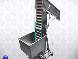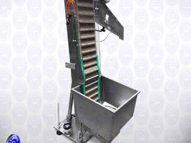 The Flamingo Cap Elevator is basically a cleated belt conveyor erected at an angle for loading of caps into the Hopper bowl to ensure automatic non-stop operation of capping machine. Caps are first fed in bulk quantity to the hopper of the machine. Cap elevators have a Photoelectric or Proximity sensor for the pause function when the track is full of caps.