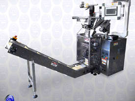 Flamingo VFFS forms sachets from a sheet of laminated plastic (roll stock); prints batch number and expire dates (Lot #s, Expiration dates, etc) onto each sachet; measures a given quantity of product and introduces it into each sachet; and Seals every sachet and separates them into individual units. The machines also have ability to pack 3 or 4 side sealed sachets, or pillow packs.